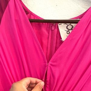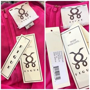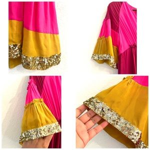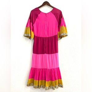 Lined statement silk Dress from Figue In vibrant light pink, dark pink, gold and garnet silk red and yellow with a shimmery gold Sequin trim on flute sleeves and hem. A quintessential luxe bohemian style; fashioned in pure silk crepe de chine. Loose caftan like fit. Simply gorgeous!!