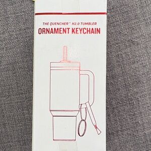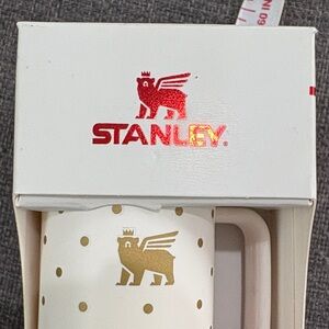 Compact Stanley ornament keychain tumbler. White body with gold polka dot pattern and gold logo. Attached red fabric strap and silver key ring. Charming portable accessory.