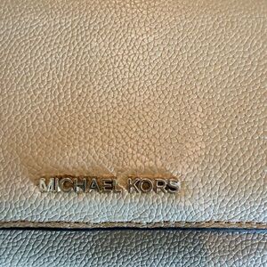 Michael Kors pebbled leather crossbody in beige-tan tones. Gold-tone chain and logo hardware. Flap front with compact silhouette. Adjustable leather-and-chain strap for versatile wear. Back pouch for phone! Very good condition overall, some very slight leather discoloration spots on front and on back-see pictures.