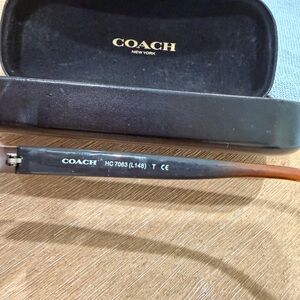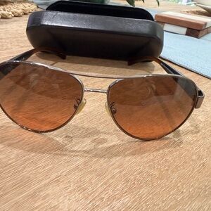 Coach aviator-style sunglasses. Brown gradient lenses with silver metal frame. Includes Coach hard case with logo. Classic, versatile look.