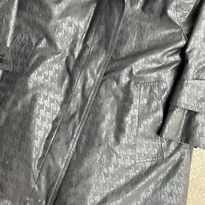 Pre-owned London Fog trench coat with general wear from previous use and storage. Outer shell shows light wrinkling and creasing along the body and sleeves, plus a few small lint or fuzz specks visible in the photos. Removable interior lining, seams, buttons, and pockets appear clean and intact in the photos without holes, tears, or structural damage.