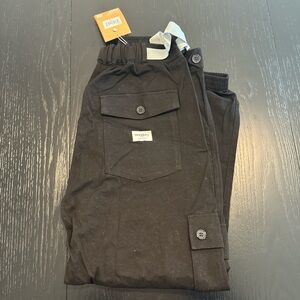 Wondery black climbing pants with adjustable waist and cargo pockets, 100% cotton. Wondery Outdoors pants, BIPOC-owned company. Originally $110.