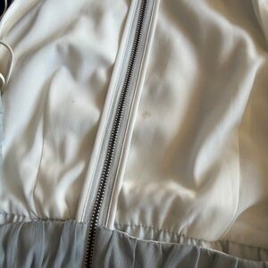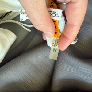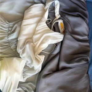 Halter neckline with an open back strap. Fitted waist flowing into a pleated, floor-length skirt. Soft ombré fade from pale blue to deep charcoal. Lightweight, airy fabric for graceful movement.