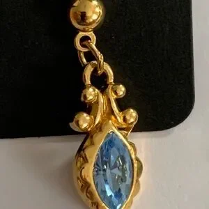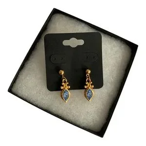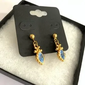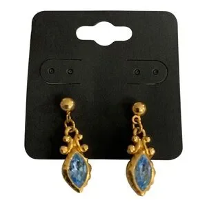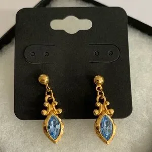 Elegant gold-tone drop earrings featuring marquise blue crystals. Lightweight and secure for all-day wear. Adds a refined pop of blue to any outfit.
