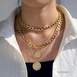Brand new, never worn, and in flawless condition — this trendy layered necklace features a retro portrait coin pendant and a five-layer chain design for a bold, statement look perfect for parties, weddings, or everyday chic.