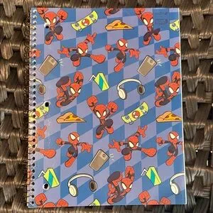 Spiral-bound notebook with repeating Spider-Man poses. Playful icons like pizza slices, headsets, and phones. Bright red Spider-Man figures on a blue patterned background. Ideal for school, notes, and doodles.