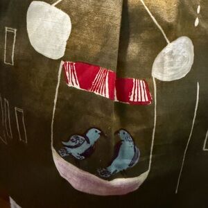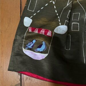 A-line midi skirt in olive green with cityscape embroidery. Subtle sheen fabric gives soft structure. White and pink stitched details create a playful scene. Red trim peeks at the hem for contrast. Flared silhouette with stitched pleats for movement.