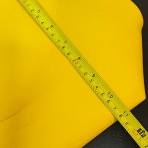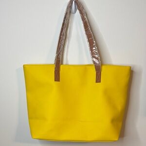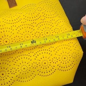 Brighten your day with this stylish yellow tote bag featuring elegant brown handles. Lined. Laser cutout design on the front. Perfect for any occasion. NWOT, handles still wrapped. Small mark on the back, see picture.