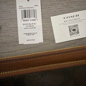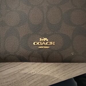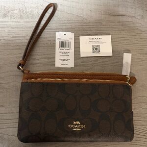 Elegant Coach wristlet with signature pattern. Features zip closure and wrist strap.
