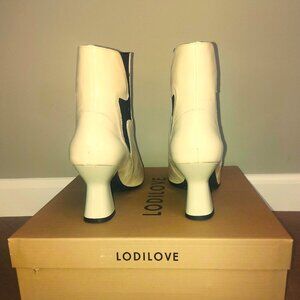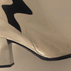 These patent leather pull-on ankle boots are made in Spain by Lodi. A striking pair of shoes with the black detail on cream, they measure 6 inches (15.24 cm) at the shaft and the heel is 2.5 inches (6.35 cm). Please note that although these boots have never been worn outside there are a couple pale red marks on the inside of the left boot that appeared when I pulled them out of storage (see photo). So annoying! Although hardly noticable when on the foot, the price reflects this flaw. Still a fabulous boot that adds unique style to any outfit....and they're comfortable!