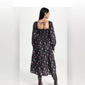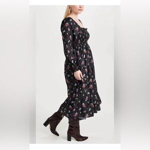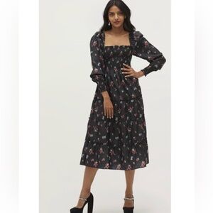 Elegant black dress with vibrant floral patterns. Long sleeves and smocked bodice. Ideal for casual outings.