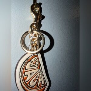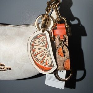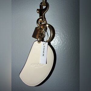 Coach leather keychain charm in cream. Features gold-tone rings and a logo tag. Simple, elegant accessory for keys or bags.
