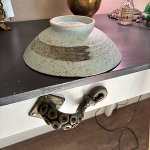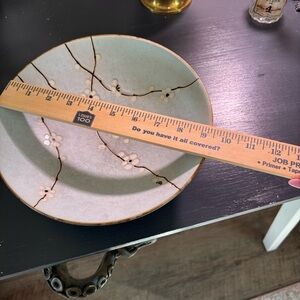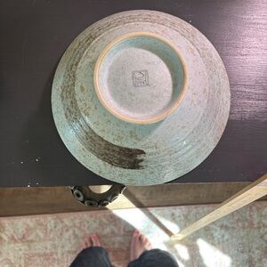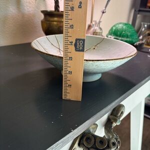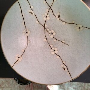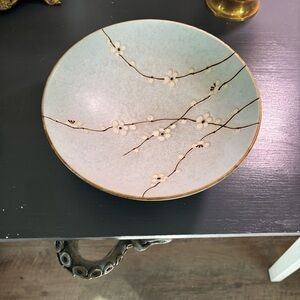Shallow ceramic bowl with delicate white blossom branches. Pale aqua glaze with subtle crackle texture. Gold-rimmed edge for a refined finish. Lovely decorative centerpiece or serving accent. No chips or cracks. Some wear inside the bowl- utensil marks or crazing