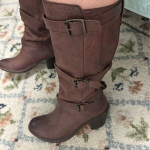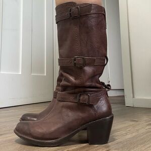 Frye brown leather knee-high boots featuring a classic design with buckle strap details and a stacked heel.