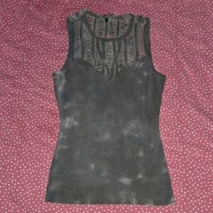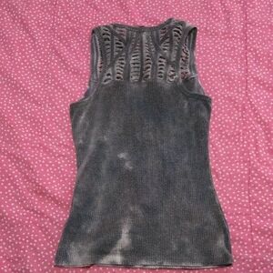 Sleek black knit tank top with a decorative lattice yoke. Soft, stretchy fabric for comfortable everyday wear. Versatile design that layers easily and pairs with skirts or jeans. Fashion-forward detail around the neckline adds an edgy touch.