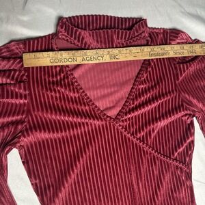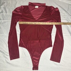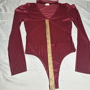 Velvet Burn Out Striped Bodysuit Large Maroon Leg O Mutton Sleeve Collar Neck