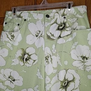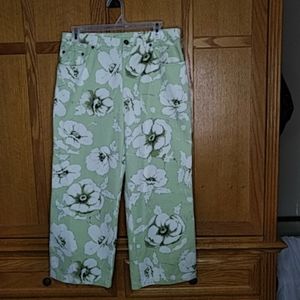 Jones Wear Sport cropped jean pants in a pretty pistachio color with white magnolia's all over it. Just so pretty and a size 8. Measurements: laying flat 15.5 in waist and 10 in rise with a 22.5 inseam.