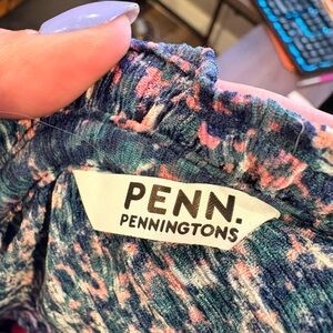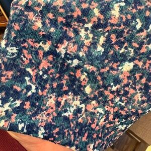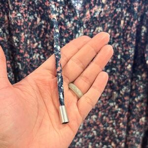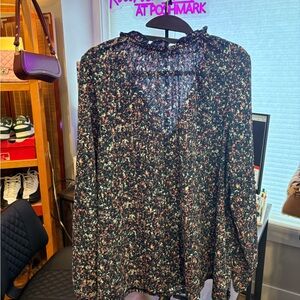 Lightweight long-sleeve blouse with a subtle V-neck. All-over tiny floral print in soft tones. Flowy silhouette. Easy, versatile top for layering.