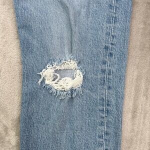 Keywords: High Rise, Distressed, Light Wash, Straight Leg, Button Fly, Denim, Casual, Classic, Premium, Streetwear, Minimalist, Everyday, Iconic, Vintage Inspired, Sustainable Fashion