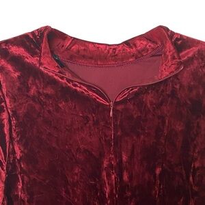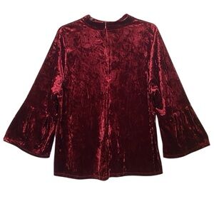 Gorgeous crushed velvet top by Ellos in a rich wine red color. Features dramatic bell sleeves, mock neck, and back zipper closure. Soft and stretchy fabric (93% polyester, 7% spandex) with a beautiful sheen. Perfect for holidays, parties, or an elevated night-out look.