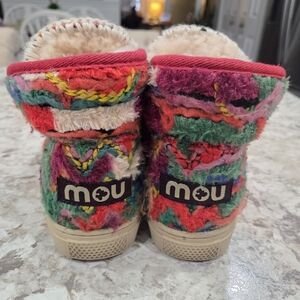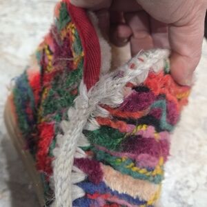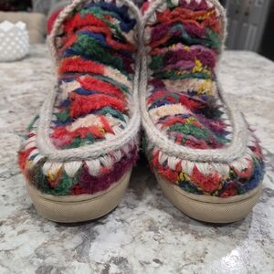 Colorful multicolor knit upper with stitched trim. Plush cream/ivory shearling lining. Rubber sole for casual wear. Vibrant boho-inspired look. Size is not indicated, but the shoes measurements are similar to that of an 8 5 or 9 women's shoe. Great condition barely worn.