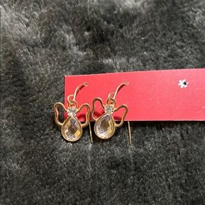 Elegant gold-tone angel earrings with a clear teardrop crystal and sparkling accent stone. Lightweight dangle style perfect for everyday wear or special occasions. Features a gold finish and clear crystal details for a refined look.