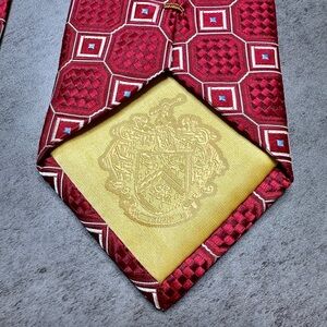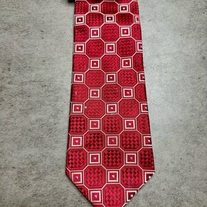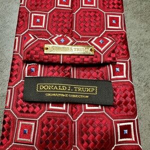 Men’s silk tie from the Donald J. Trump Signature Collection featuring a bold red geometric pattern with subtle blue and white accents. This tie has a classic, polished look that works well for business attire, formal events, or adding a sharp statement to a suit.