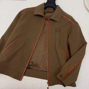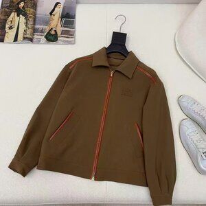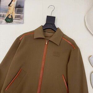 Features a classic lapel collar and full zip closure. Leather trim on the shoulders, cuffs, and pocket edges enhances the retro workwear feel. An embossed Miu Miu logo on the chest subtly showcases the brand's identity. The short silhouette and slightly puffed sleeves flatter the figure and pair well with various bottoms.