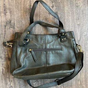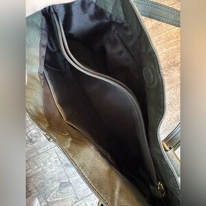 Etienne Aigner Green & Gold Hardware Handbag with Crossbody Strap. Beautiful dark green color genuine leather, handles & longer crossbody strap that can be taken off if preferred with gold hardware that compliments the green perfectly.
