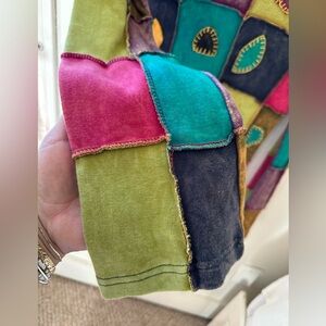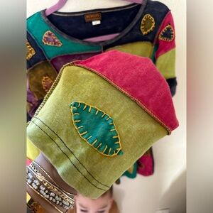 Colorful patchwork design. Leaf appliqué details. Long sleeves. Ideal for casual outings.