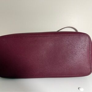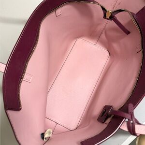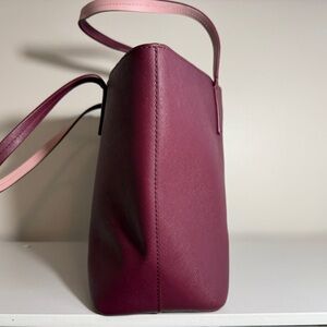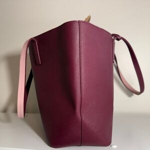 Chic Kate Spade tote in deep red. Features pink interior and handles. Perfect for everyday use.