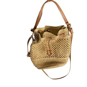 Boho Crochet Straw Bucket Bag Woven Raffia Drawstring Crossbody Shoulder Purse