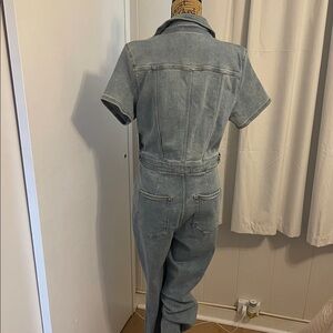 Structured short-sleeve denim jumpsuit with front flap pockets. Defined waist with buttoned tabs for shape. Straight leg for effortless wear. Classic light wash denim for versatile styling.