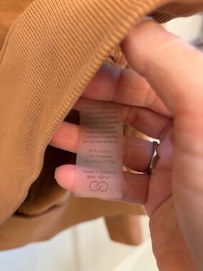 85% cotton. Reminds me of something you would find at Athleta or Lululemon. Washable.