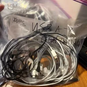 Mixed lot of USB-A to Lightning charging cables in multiple lengths. Includes a variety of white, black, and braided cords as shown. Good for iPhones, AirPods, and other Lightning devices that use standard USB-A charging blocks.