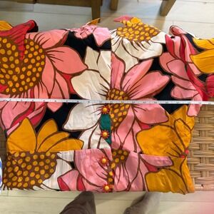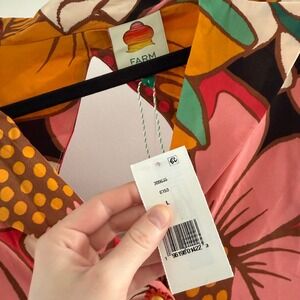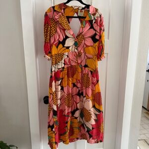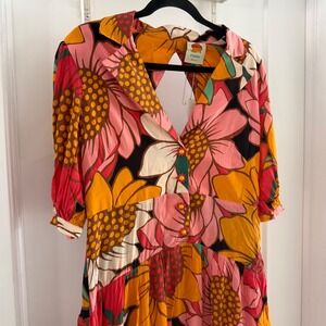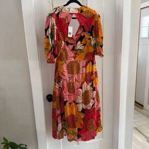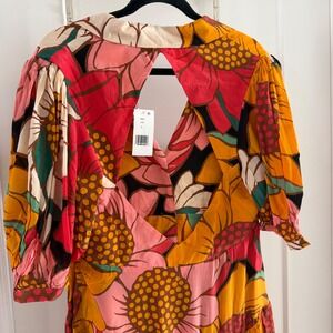 Farm Rio Colorful Sunflowers Midi Dress Pink Orange Floral Puff Sleeve L NWT