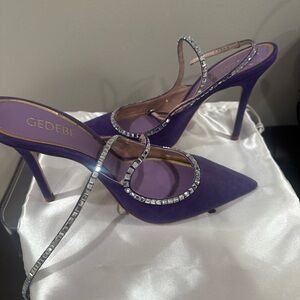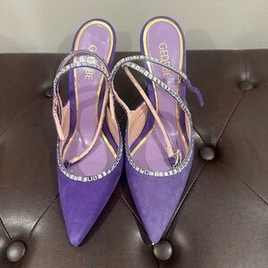 Elegant purple stiletto heels by . Pointed-toe silhouette with crystal-embellished straps for a glamorous finish. Smooth suede upper and slim high heel for a sleek look. Perfect for evening events and special occasions.