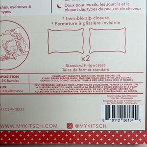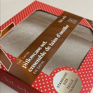 Satin pillowcase duo by Kitsch. Smooth, lustrous fabric with a subtle sheen. Includes two standard pillowcases. Soft, neutral silver-taupe tone (champagne). Brand New in box. Box has never been opened. Note: front of box has mild scuffs in foil as photographed. See photos closely.