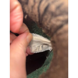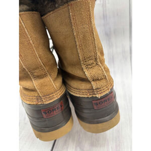 I see the tag says 7, but I am a women’s 8.5-9 and I wore them. So I would say they would be way too big for a 7. Pre-owned Sorel Kaufman, Canada snow boots. The boots are made of suede leather (tan) and rubber (dark brown). They feature a brown faux fur lining, lace-up closure with teal and white laces, and a rubber outsole. Approximate dimensions are unavailable. The boots show signs of wear, including scuffs and discoloration on the leather and rubber. The laces are slightly frayed. Overall, the boots are in fair condition for their age and use.
