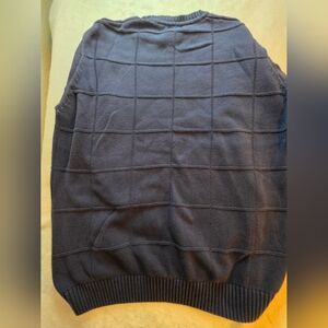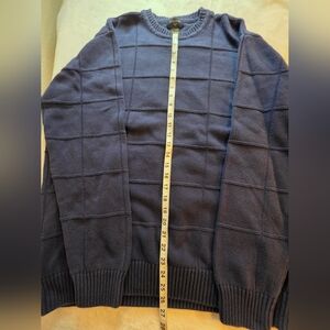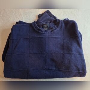 Mens Dockers Knit Sweater XL Tall Navy Blue Grid Pattern 100% Cotton Crewneck Men's. Classic Dockers men's knit sweater in a dark navy blue color with a textured grid pattern. Comfortable 100% cotton material with ribbed collar, cuffs, and hem. Great casual sweater for everyday wear, work, or layering in cooler weather. Approximately Measurements are Pit to Pit 26 in Length 27 in. (B7)