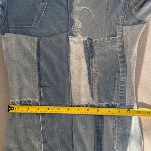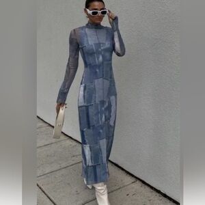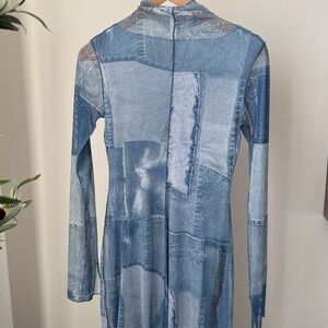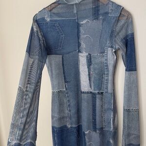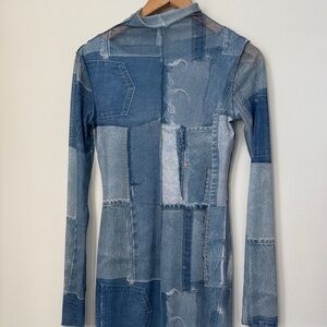 Fitted long sleeve dress featuring an all-over patchwork denim print. Designed with a high neckline and soft stretch fabric that offers a flattering, comfortable fit. Stylish and versatile piece that can be worn on its own or layered for different looks.