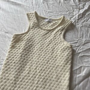 Elevate your wardrobe with this Ardene cream knit sweater dress, size Medium, in new condition without tags. Featuring a textured sleeveless design, classic round neckline, and a flattering midi length, this piece blends cottagecore charm, coastal grandmother vibes, and minimalist elegance.