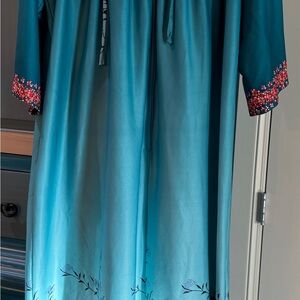 Tiffany & Co. loungewear piece in light turquoise. Features blue embroidered branding on label. Smooth, soft-looking fabric. Vintage 70’s-80’s.
