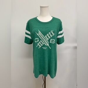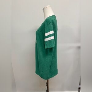 Green t-shirt with white graphic and stripes.