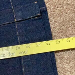 This beautiful dark denim midi skirt is so versatile. It has 2 front hip pockets and 2 back pockets. The waist measures 30” and the length is 31”. Pull on style skirt.