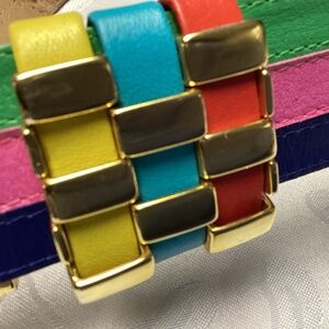 Questions? Leave a comment below! this is an incredible colorful belt. This is an inherited item so it’s been in storage. Please note I have put all the pictures up of any discrepancies in the item. There is a little bit of a scratching on the interior. He actually there’s really nothing wrong on the exterior. It’s positively beautiful. You can see every color it measures from end and 37 inches. Ask if you need more it’s been meticulously stored and I’m not sure if this is a VIVIENNE Westwood belt or not??? All I know is it says VIVIENNEN it as you see in the picture that’s the only thing I know about it. I’m sure it’s vintage if anyone knows anything about this. Please help there is a logo in there and I’ve tried to capture the picture it’s made in Australia all leather absolutely gorgeous.