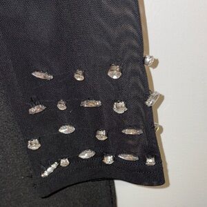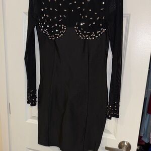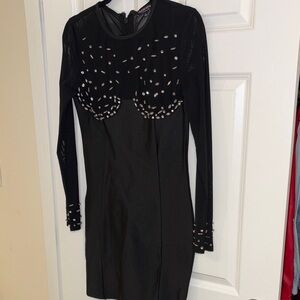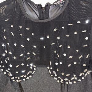 Sleek black dress by Fashion Nova. Sheer mesh yoke and long sleeves. Scattered rhinestone embellishments create sparkle. Feminine scalloped detail at bust. Perfect for evening events.
