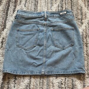 A versatile light blue denim skirt with a clean A-line silhouette. Features front pockets and a button waist for easy wear. Soft, durable denim perfect for casual outfits. Light blue color complements many tops and shoes.