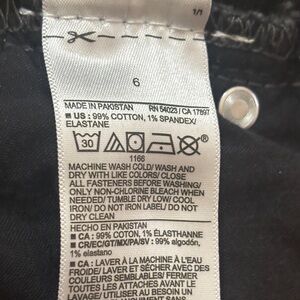 Barrel jeans with a subtle washed black finish. Classic five-pocket styling and straight tapered leg. Sturdy denim made for everyday wear. Easy to pair with casual outfits. Approximate measurements laying flat are: waist 14.5”, rise 11” and inseam 25”. Jeans are in good used condition.