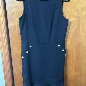 Sleek sleeveless midi dress from LOFT. Fitted waist with decorative button details at the hips. Clean, streamlined silhouette. Subtle flared hem for movement. Easy to dress up or down.